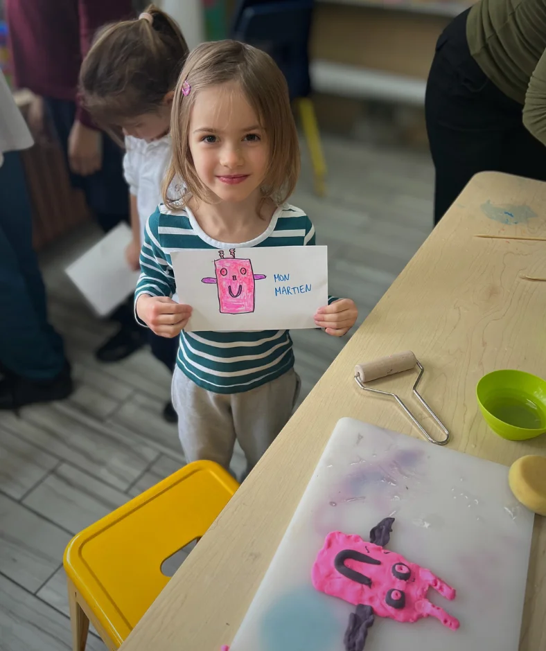 Pour cet Atelier Bricolage spécial, les élèves de maternelle 4 ans ont d’abord dessiné un personnage, puis lui ont donné vie en le façonnant en pâte à modeler ! Réalisée en collaboration avec la classe de 5e année, cette activité artistique favorise la transposition de la 2D à la 3D, la structuration de l’espace et la créativité.